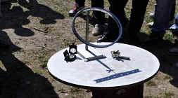 | La mancanza di tempo per costruire una base per il Globo (diametro di 30cm - anno costruzione 1964!!!) con un goniometro adeguato, è stata risolta utilizzando un cerchio di Ipparco fortunatamente dello stesso diametro, costruito con materiale di recupero, nel 2002. L'inclinazione è stata misurata usando il clinometro tipo Abney, visibile nella foto insieme ad una bussola di precisione. | ||